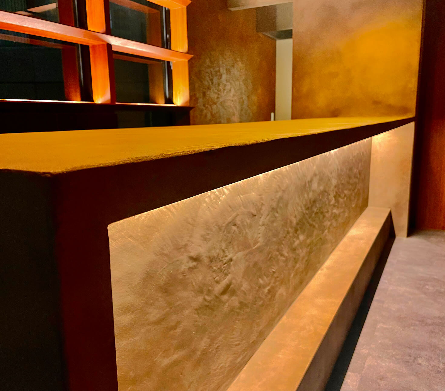 モルタルのイメージを超えた“多彩な質感”を左官職人の技術で自在に表現でき、自由な発想が、ステキな個性を導き出します。壁をはじめとする天井・床はもちろんの事、今までその発想も無かった、家具への仕上げ材としても最適です。